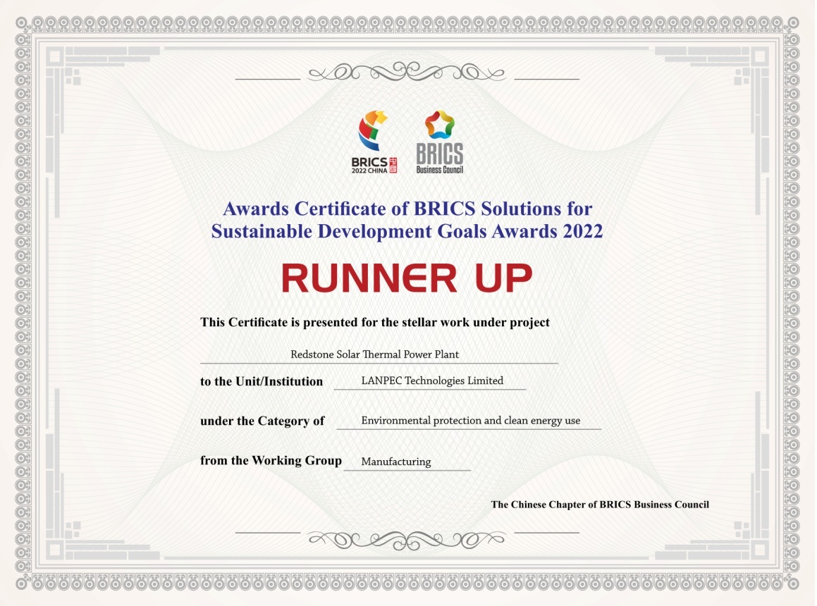 The Redstone Concentrated Solar Power Plant Project in South Africa was awarded the BRICS Sustainable Solutions Second Prize